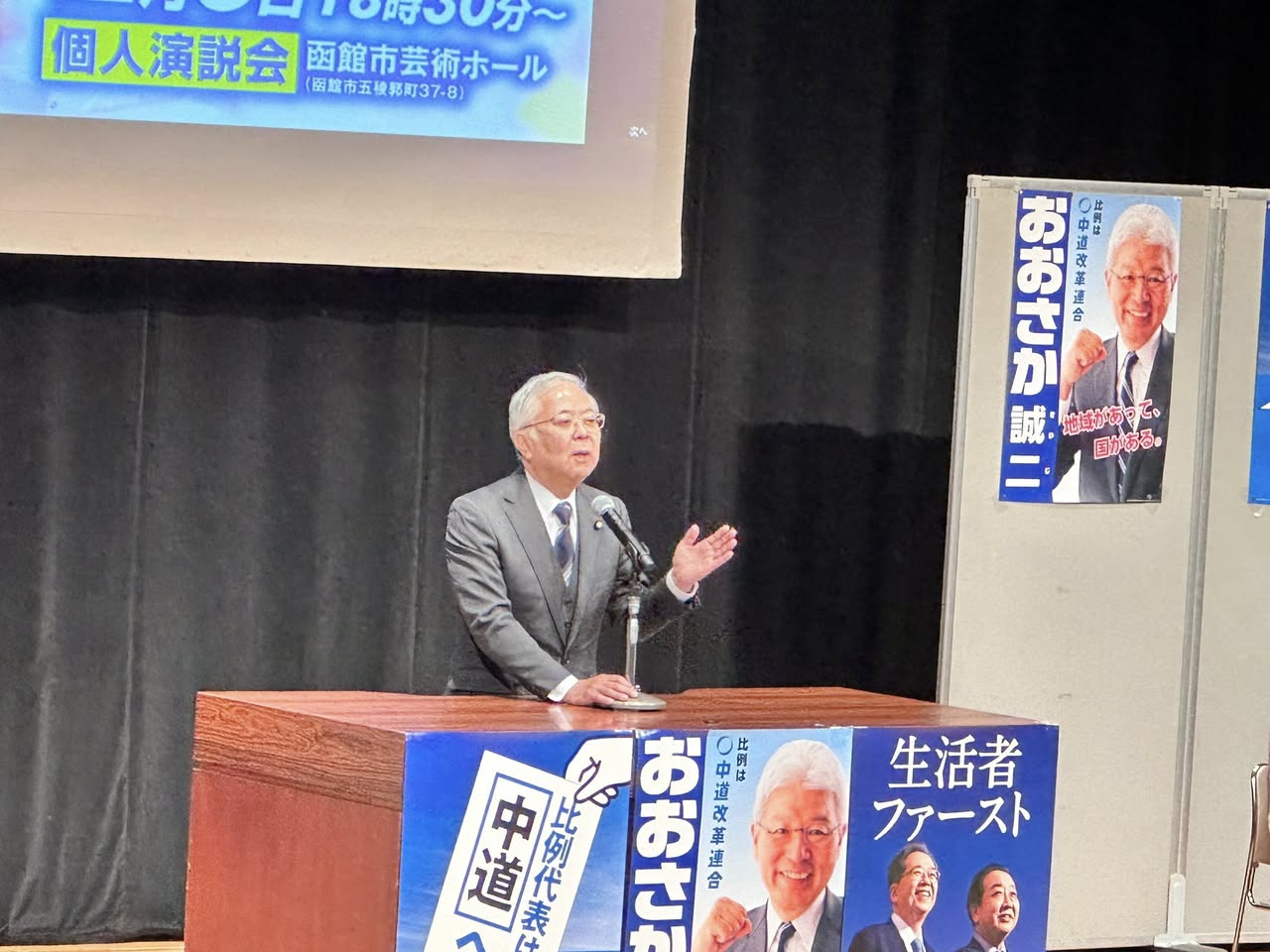 函館市内で開催された、北海道衆議院第8区・おおさか誠二候補の個人演説会にて、応援のご挨拶とご支援のお願いをさせていただきました。
